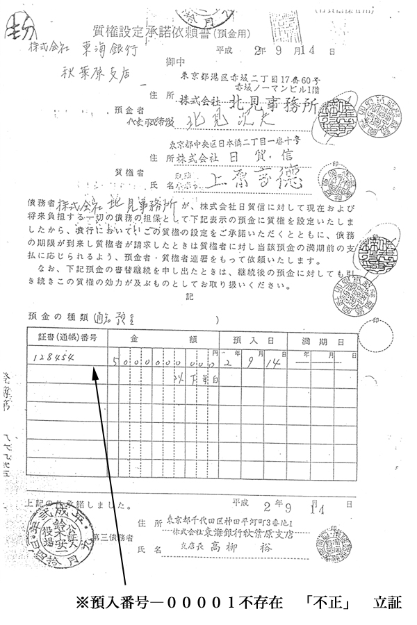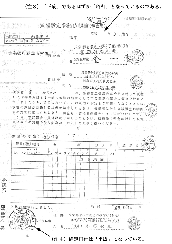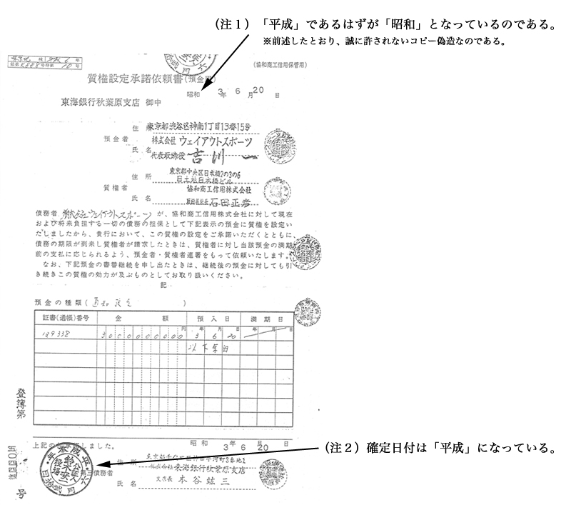 つまり、詐欺事件の被害者である協和商工信用(株)は自らの「質権設定承諾書」「預入番号-00007」存在を「正規」とし「預入番号-00001」不存在を「不正」としているのである。