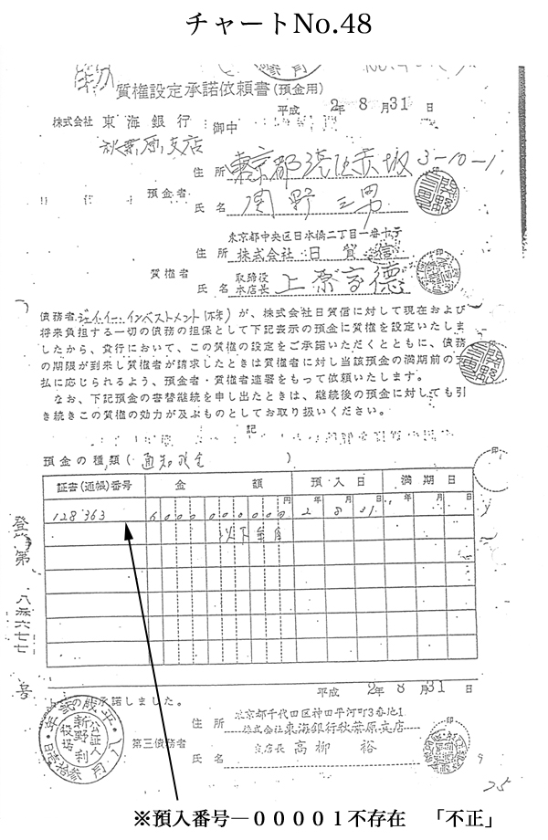 その理由は弁護人から「正規」とする「チャート50」、前述の「(株)泰斗」の件に使用された「質権設定承諾手続書類一式(原本)を開示せよ」と強く要求されたことにより、慌てて「富田(株)」の件を「正規」の質権設定手続としてコピー偽造を行って開示したのである。前述と同様に、「昭和3年6月10日」、この「昭和」が自らの職務犯罪行為を立証する証拠となったのである。
