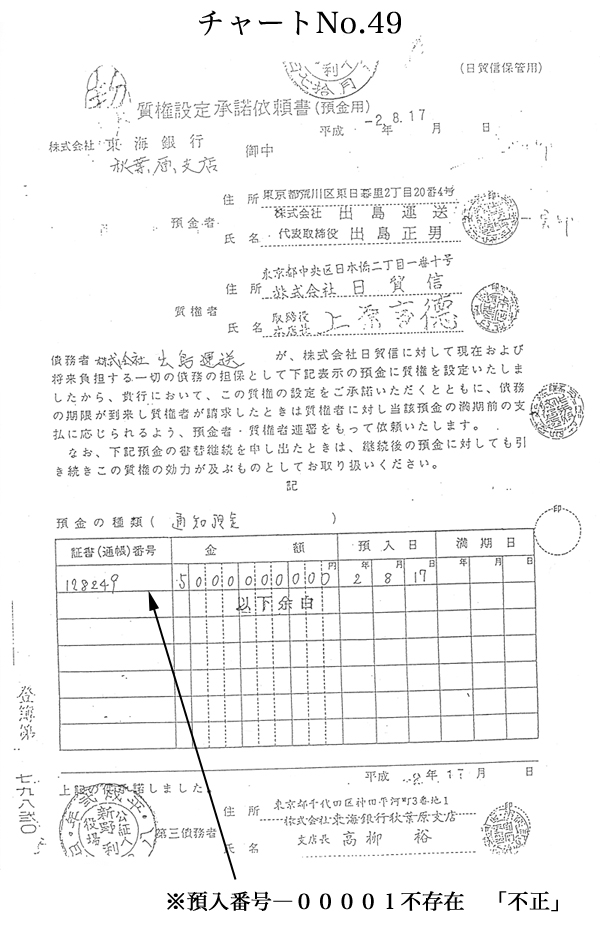 更に検証していただきたいのが(株)日貿信の取引に用いられた「質権」である。 「チャート50」 の「(株)日貿信VS (株)泰斗」の取引に用いられた「質権設定承諾書」検証ください。