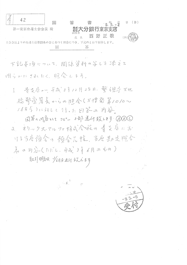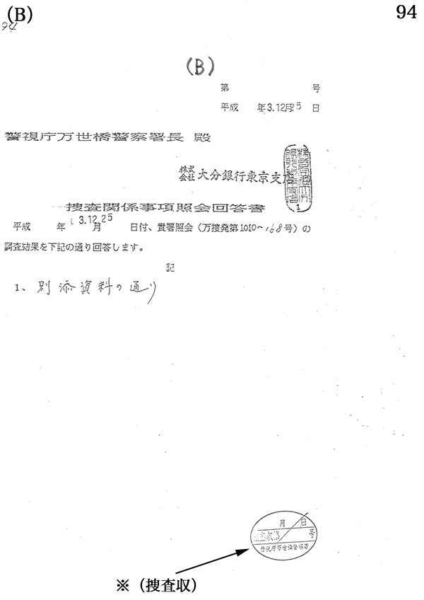 (ア) 平成3年12月25日付大分銀行東京支店に対する捜査機関照会書(甲16)号証をご検証いただきたい。
