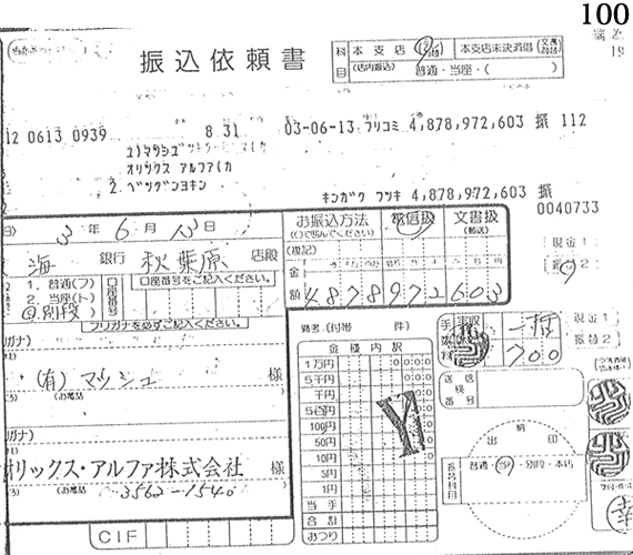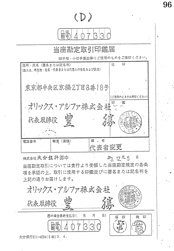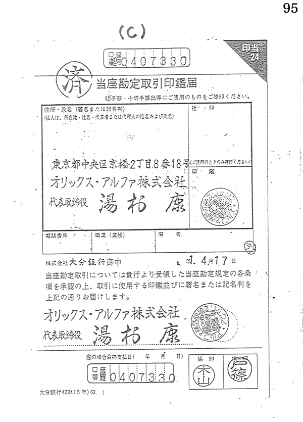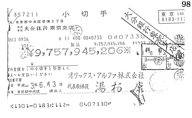 つまり、大分銀行東京支店内オリックスアルファ(株)の当座預金口座に自らの小切手による「数字」の残高を作成したうえで東海銀行秋葉原支店の別段預金にオリックスアルファ(株)が大分銀行東京支店内で融資金振込送金手続きをとったことを証明したものである。因みに「別段預金口座」は東海銀行の口座である。
