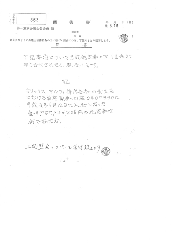 (イ) 平成3年12月25日付 大分銀行東京支店に対する捜査機関照会に対する回答書(甲17号証)