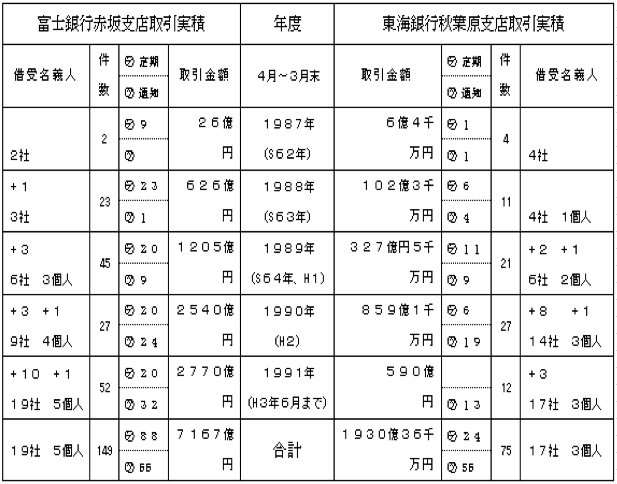 同様に東海銀行銀行員は、平成3年9月18日萩生田勝ほか2名作成「東海行秋葉原支店を舞台とした不正融資事件融資実態解明報告書」(検察側立証証拠甲129号証)では昭和62年3月11日チャート〔1〕〜平成3年6月28日チャート〔75〕まで「75件」、総額1930億3600万円、定期預金「24件」通知預金「56件」を用いた取引が解明されている。 これも後日客観的証拠で立証するが、前述の富士銀行同様の「書替え」が多数有り最高9回が存在するのである。この客観的証拠に基づく事実は、大蔵省(現財務省)指導による後述するような特別な「銀行VSノンバンク」による巨額融資取引、それも9回も書替えが可能な銀行の「一般貸出債権」流動化用「約束手形債権」一式を用いた各ノンバンクの巨額金融取引が存在していたなによりの証左なのである。 マスコミはこの約5年以上も継続された取引実体を知りながら報道しているのであるから、経済常識、社会常識がかたよっているのである。尚、申し上げるなら、当時の警視庁に利用されたマスコミ関係者はこのあと、警視庁が本件捜査の「失敗」を正式に認めるコメントを発表している事実は知っている。そして警視庁はIT関係とか公認会計士とかを捜査員として採用するのである。銀行に利用されない位に捜査員の訓練も実行したのである