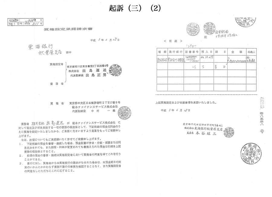 ※なお起訴当日には、このコピー偽造「質権設定承諾書」(原本)は提出されず、公判で弁護人による再々の(原本)開示申請により、やっと平成7年11月24日それも写真の(原本)が東海銀行から提出されたのである。これも当然、「写真」による偽造なのである。