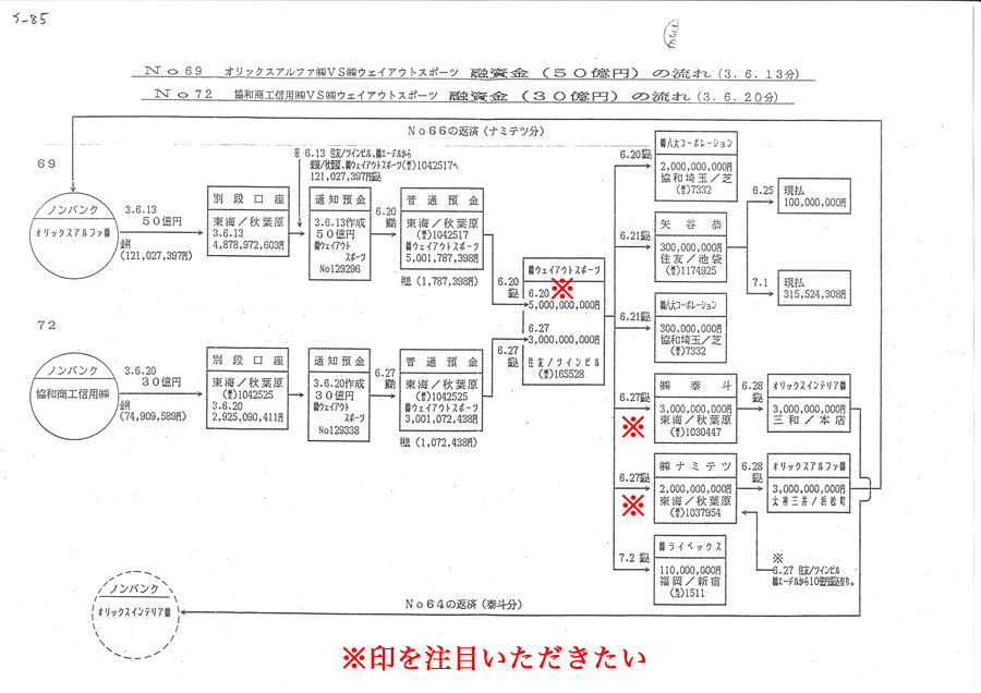 6月20日の50億円が7日後の6月27日に住友ツインビル支店から東海銀行宛に入金された証拠であり、まったく50億円は使用されず単に「散歩」を楽しんだのである。この事実こそ、金融機関内限定の「BIS規制8%」クリア目的用融資金の金融機関内限定としたシステム化なのである。