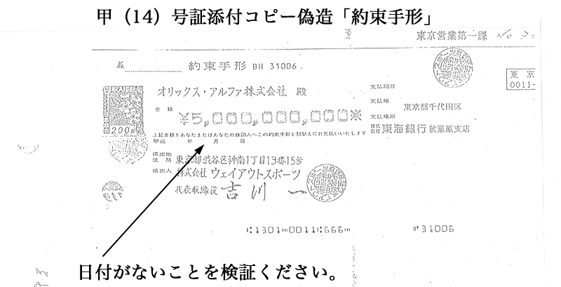 すなわち、貴殿捏造の詐欺事件「協力預金」資金融資取引に用いた、犯罪取引構造である「オリックスアルファ(株)VS(株)ウェイアウトスポーツ」とするコピー偽造の立証証拠は、まったく別な金融取引に基づく「東海銀行VSオリックスアルファ(株)」の「約束手形債権」一式を用いた取引である真相が判明したのである。