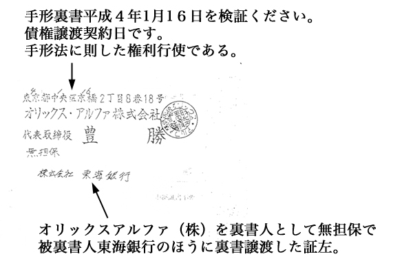 上記の通り約束手形原本を用いて平成4年1月16日に東海銀行とオリックスアルファ(株)との間で「約束手形債権」一式を用いた債権譲渡契約が結ばれた証なのである。まさに、この行為は民間における民事・商事の経済取引に刑事が民事不介入の大原則を無視し介入した検察の暴挙の証左なのである。